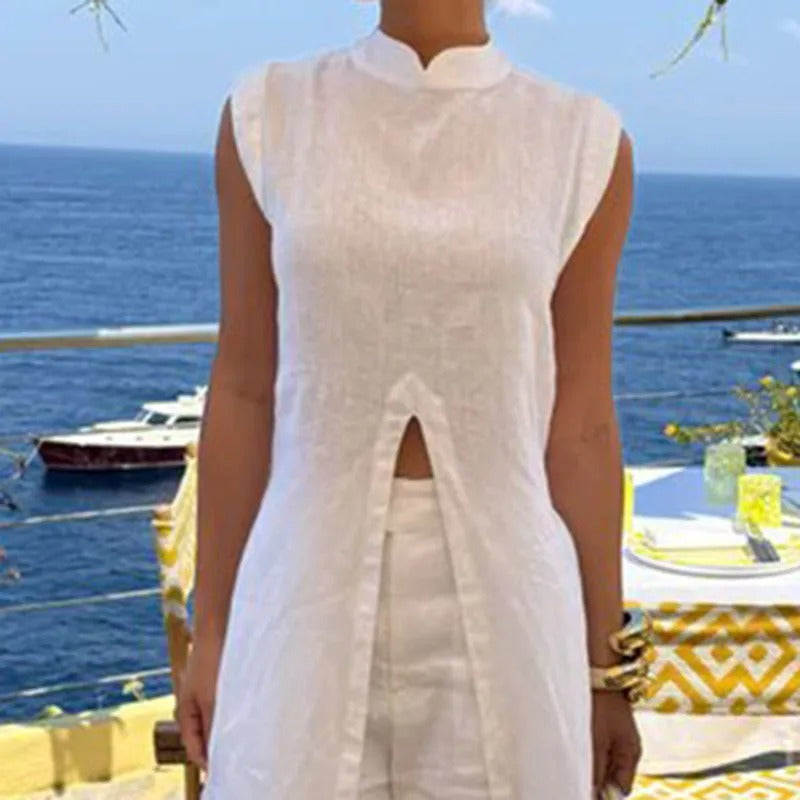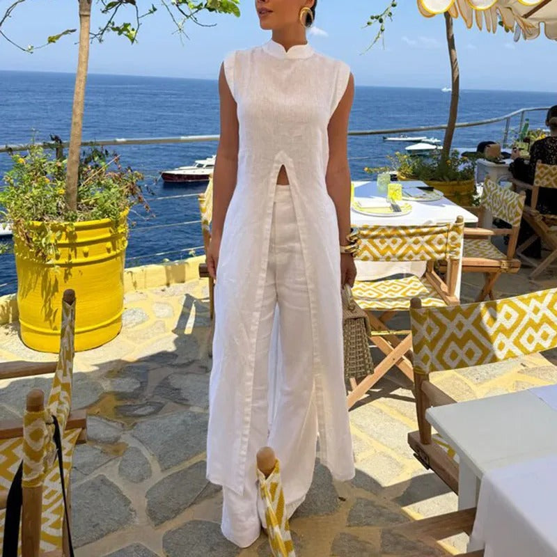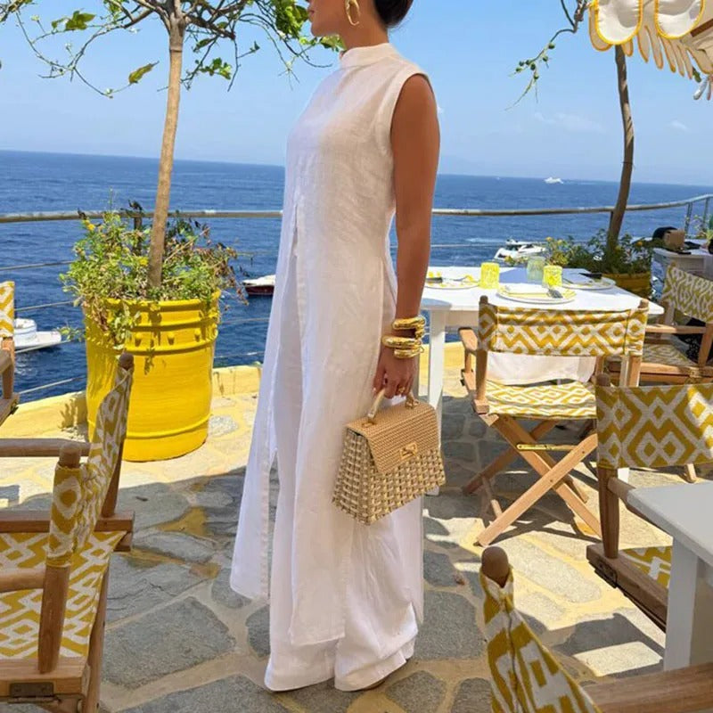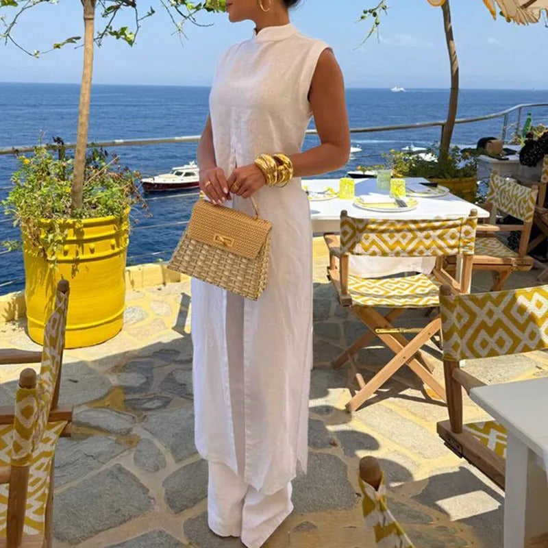 Stell dir vor, du ziehst dich morgens an und fühlst dich sofort komplett gestylt – ganz mühelos. Genau dafür wurde dieses atmungsaktive Zweiteiler-Set entwickelt. Das ärmellose lange Oberteil schmiegt sich dank eines eleganten Frontschlitzes an deine Silhouette, während die weit geschnittenen Hosen bei jedem Schritt mitbewegen und selbst an den heißesten Tagen für Luftzirkulation sorgen.